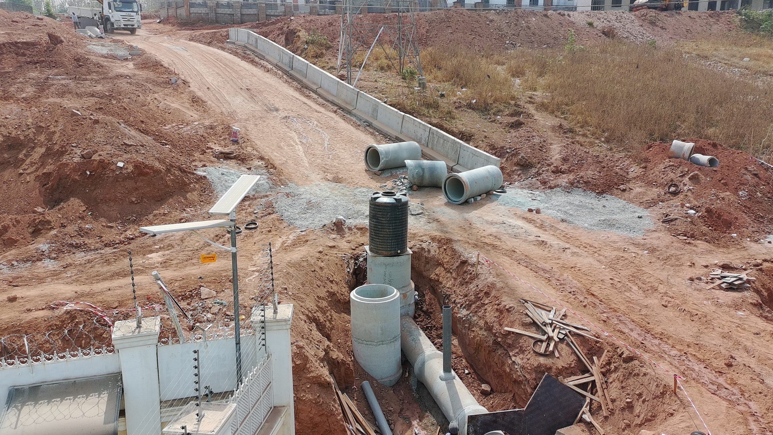 Pipe Installation: Stormwater pipes (400mm diameter) and sewer pipes (200mm diameter) are being laid. Long protruding pipes (curly outlets) collect surface runoff from the road and discharge it efficiently. A sand trap has also been successfully created.